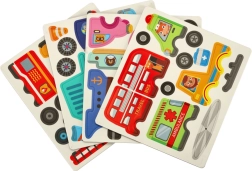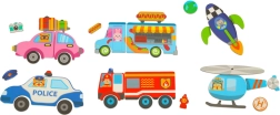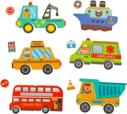 Bus, ambulance, taxa, politibil, lastbil, skib og raket. Ekstra elementer som kegler og skilte bringer hver scene til live.