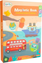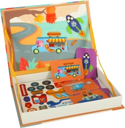 Denne magnetiske puslespilbog forvandler hver åbning af “bogen” til en legende rejse gennem transportens verden. Åbn låget med den magnetiske tavle, vælg et mønsterkort, eller brug fantasien og saml egne køretøjer og scener af farverige magneter. Børn kan skabe en brandbil, ambulance, bus, taxa, politibil, lastbil, et skib og en raket – samt mange flere kombinationer.