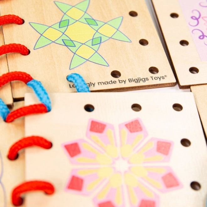 Kreative træbilleder til snøring fra BIGJIGS TOYS udvikler finmotorik, øje-hånd-koordination og tålmodighed. Farverige mønstre og mange snøre i forskellige farver motiverer børn til at skabe og øve færdigheder. Sikker udførelse og materialer af høj kvalitet sikrer lang levetid og masser af legesjov.