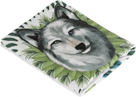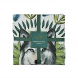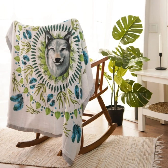 Det smukke ulvemotiv omgivet af grønne blade og blå fjer vækker modet. Et dekorativt element skaber et unikt udseende i omgivelserne.