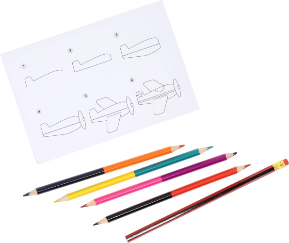 - Komplet udstyr: tegneunderlag, 4 dobbeltsidede farveblyanter (8 farver) og en blyant med viskelæder.