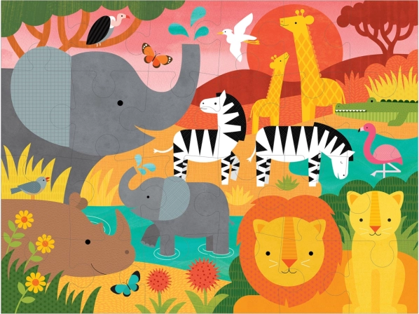 Tag på eventyr på den afrikanske savanne med vores gulvpuslespil. Denne puslespil er ideel til børn fra 3 år. Det indeholder 24 brikker, som er designet til leg på gulvet, hvilket giver børn frihed til at bevæge sig og være kreative under samlingen. Produktet er pakket i en praktisk æske med snorehåndtag af genbrugskarton for nem transport.