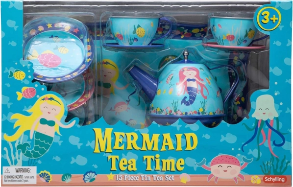 Når det er tid til te, er der intet bedre valg end dette vidunderlige metalsæt. Kreativiteten blomstrer, når dine børn byder venner, dukker og bamser på te med dette flotte sæt. Sættet indeholder 4 kopper med underkopper, 4 desserttallerkener, en tekande med låg og et serveringsfad – alt i havfruedesign.