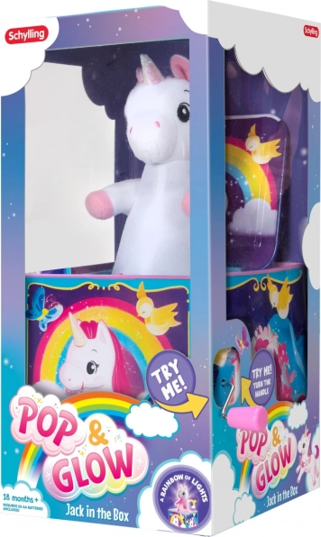 Oplev en magisk kombination af en klassisk spilledåse og moderne effekter. Når du drejer på håndtaget, lyder den populære melodi, og fra den farverige boks springer en plysenhjørning op, som lyser med et blødt flerfarvet skær. Ideel som gave til små børn, der elsker overraskelser, musik og eventyrlige figurer.