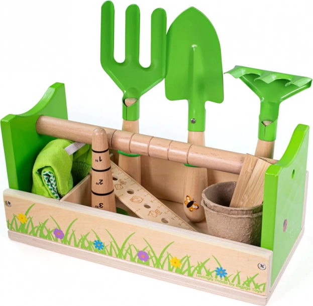 Dette farverige havesæt udvikler børns fingerfærdighed, tålmodighed og forhold til naturen. Alt er opbevaret i en solid trækasse med frisk grønt design med mariehøns og blomster. Børn kan trygt prøve at plante, løsne jord og måle, mens de efterligner de voksne.