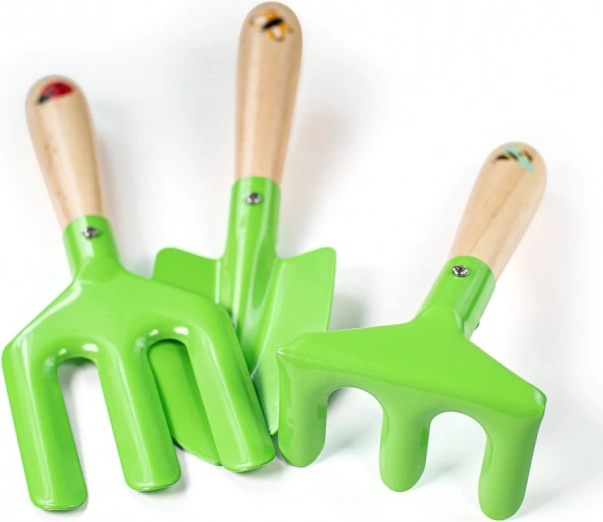 Hver del er designet til små hænder: glatte træhåndtag ligger behageligt i hånden, metaldele er holdbare, og stofhandsker beskytter under arbejdet. Sættet er perfekt til leg i haven eller i sandkassen, og takket være den kompakte opbevaring er alt altid lige ved hånden.