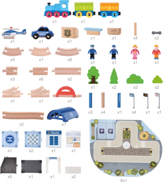 Denne detaljerede trætogbane er ideel til små ingeniører, der elsker tog og politieventyr. Den indeholder en bane med bro, en attraktiv politistation og andre tilbehør, inklusive bil og helikopter.