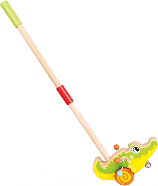Højkvalitets, populært trælegetøj i krokodilledesign. Krokodillen på pind har en klokke og laver lyde, når den kører. Et legetøj, som barnet kan skubbe foran sig, og som hjælper med at udvikle motoriske færdigheder. Børn lærer også på denne måde at skelne mellem farver og dyr. Skubbelegetøjet har gummibelagte hjul for en stille kørsel. Børn kan skubbe eller trække det både indenfor og udenfor. En smuk gave til dit barn. Hovedfunktioner: støtter barnet i de første skridt, sjovt og sødt, udvikler motoriske færdigheder