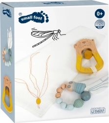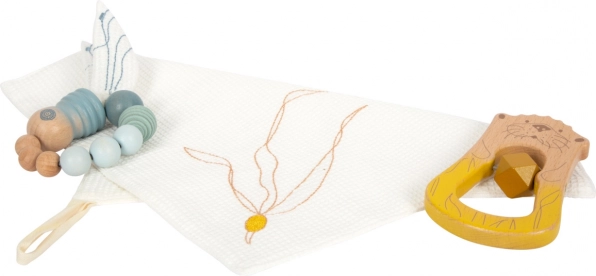 Denne 3-delte sæt til nyfødte er ideel som 'første legetøj' til dit barn. Sættet tilbyder en bidering og rangle i én havodder, en bomuldsklud til kram eller savling, og en sanselegetøj guldsmed med vinger indeholdende knitrefolie. Hvert legetøj er designet med fokus på udvikling af motoriske færdigheder og sanselig opfattelse.