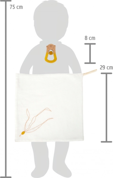 Kan bruges som krammeklud eller savleklud. Har en løkke til nem fastgørelse til ranglen, sutten eller barnevognen.
