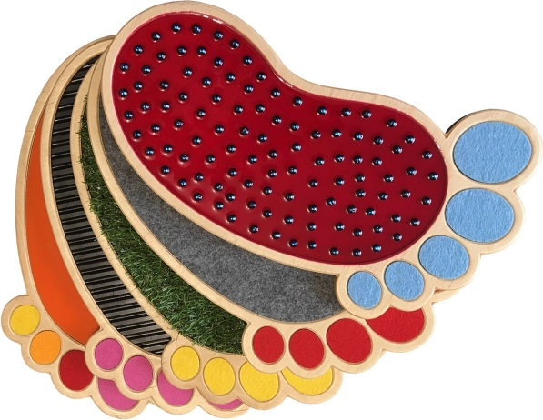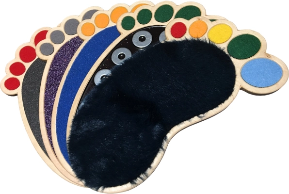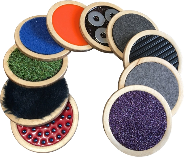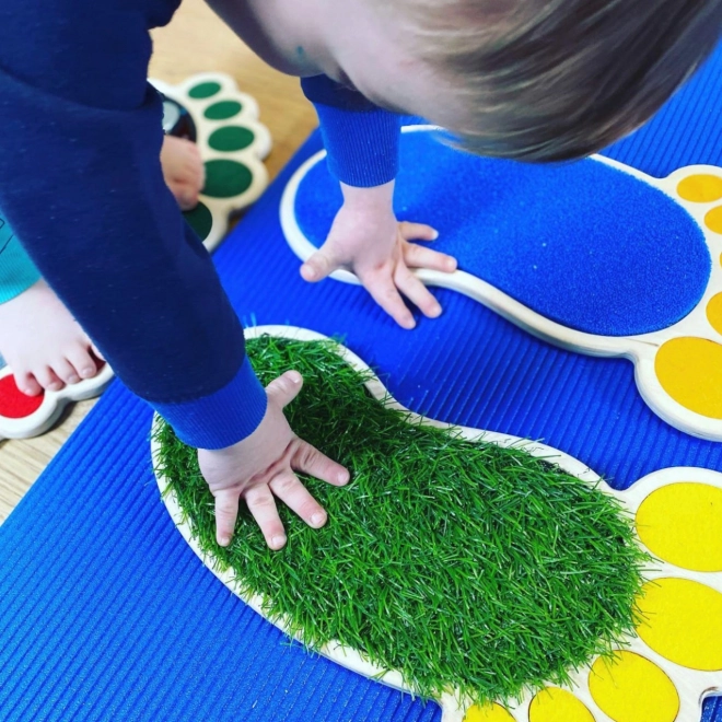 Sættet indeholder mange typer overflader, såsom filt, silikoneskum, kunstgræs og mere, der hjælper med at udvikle berøringssans og finmotorik.