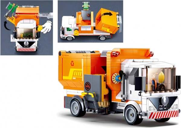 Sættet indeholder en arbejdsminifigur, skraldespand og gennemarbejdede detaljer på køretøjet, inklusive læssemekanisme til “affaldsindsamling”. Takket være kompatibilitet med LEGO, Cobi, Mega Bloks og andre mærker kan du nemt udvide din by og finde på dine egne historier.
