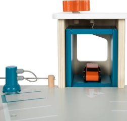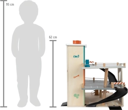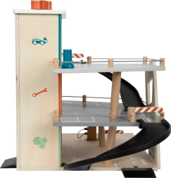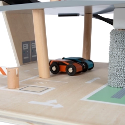 Opdag et alsidigt træparkeringshus med tre etager, funktionel elevator og glidende ramper til timevis af kreativ leg. Inkluderer 2 biler, tankanlæg og ladestation, løfterampe og vask med realistiske børster. Mekaniske bomme på hvert niveau og gummiafskærmning for sikker kørsel giver legen ekstra dynamik. Den holdbare kombination af træfiner, massivt træ og ugiftig plast sikrer lang levetid.