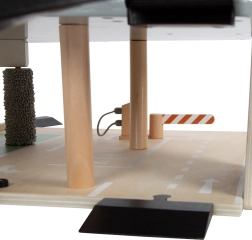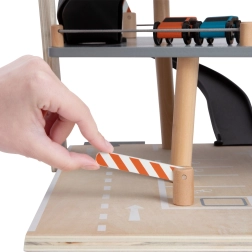 Dette stilfulde træparkeringshus til racerbiler bringer et rigt udstyret legeunivers til børn. Tre etager er forbundet med en funktionel elevator og to glidende ramper, der giver bilerne jævnt flow. Hvert niveau er udstyret med en mekanisk bom og gummiafskærmning, som øger dynamikken og forhindrer, at køretøjerne falder ud. Farvede ikoner og vejskilte støtter læring gennem leg og udvikler fantasien.