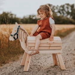 Træhesten står på robuste ben, som sikrer stabilitet og sikkerhed under leg. Takket være denne konstruktion er den velegnet til børn fra 3 år.
