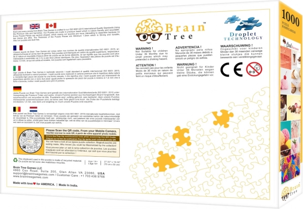 I æsken finder du alt, hvad du skal bruge til komfortabel samling: en plakat i samme kvalitet som motivet på puslespillet, flere kartonbakker til sortering, en stander til æskelåget for bedre overblik og i sættet med 1000 brikker også en robust lynlåspose til sikker opbevaring af brikkerne.