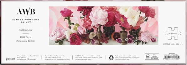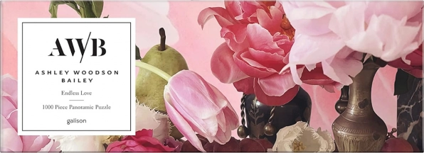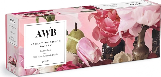 Det panoramiske puslespil Endless Love præsenterer et elegant blomsterstilleben fyldt med tulipaner og pæoner i sarte rosa og grønne nuancer. Takket være førsteklasses tryk og mat finish træder detaljer og farvedybde tydeligt frem, så samlingen er lige så smuk som det færdige billede. Værket er skabt af den amerikanske kunstner og fotograf Ashley Woodson Bailey, kendt for sine raffinerede botaniske kompositioner.