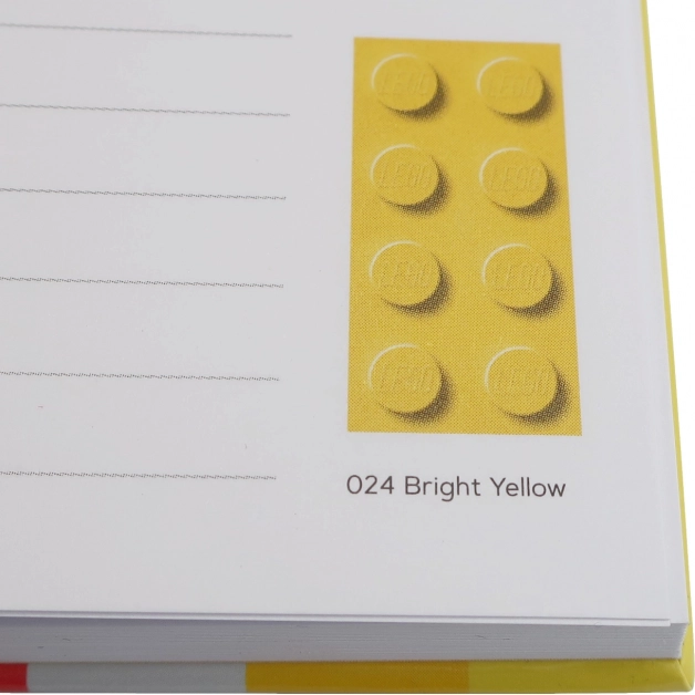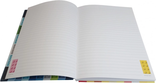 Hver linjerede side indeholder en illustration af en klods i en bestemt LEGO-nuance, som gør skrivningen sjovere og fremmer kreativiteten.