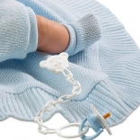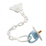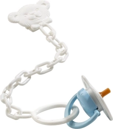 Den praktiske sut med kæde og klips kan nemt fastgøres til tøjet, så den ikke bliver væk, og babyen hurtigt kan beroliges.