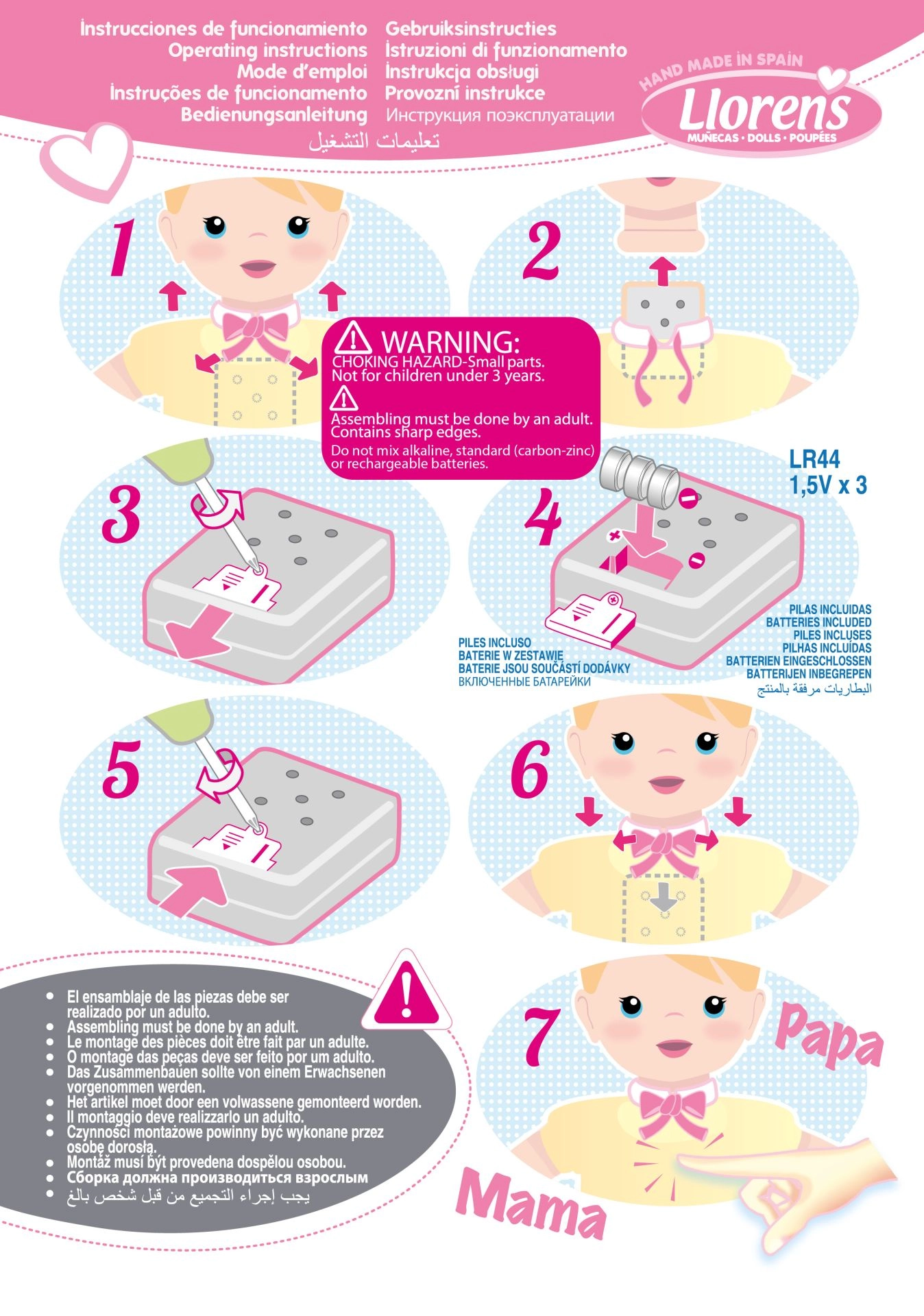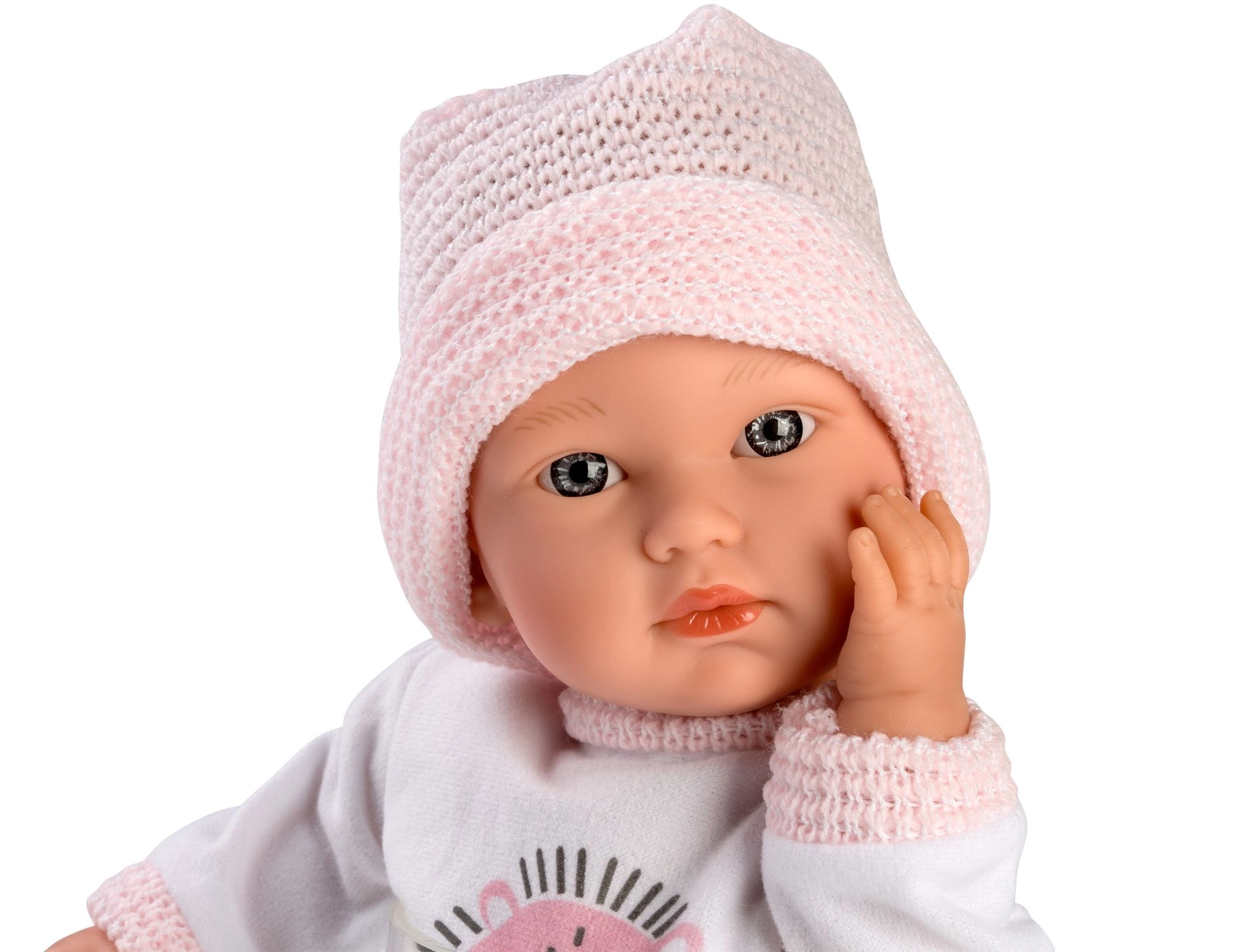 Når man trykker på maven, græder dukken og kalder “mor, far”, hvilket fremmer empatisk leg og sociale færdigheder. Tøjet med det søde print og den strikkede hue er let at tage af og på og udvikler finmotorikken.