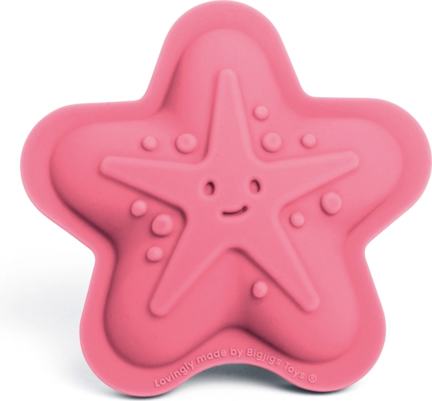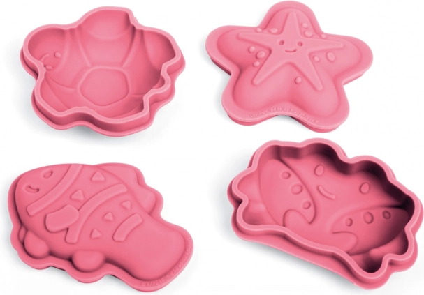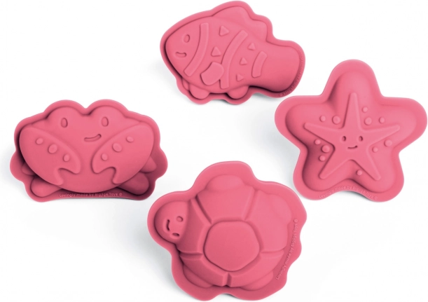 Lyserødt sæt med 4 silikoneforme fra Bigjigs Toys med havmotiver, der giver børn masser af kreativ leg i sandkassen og ved vandet. Fremstillet af 100% silikone, som er varme- og pletbestandig, nem at rengøre og let at trykke ud af. Inkluderer en bomuldspose til praktisk opbevaring. Velegnet fra 18 måneder.