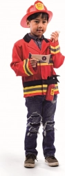 Børne-brandmandskostumet fra BIGJIGS TOYS tilbyder alt, hvad små brandmænd behøver til en spændende redningsmission. Den klare røde jakke med stribede ærmer og emblem, justerbar hjelm (49–55 cm) samt tilbehør som brandslukker i træ, walkie-talkie og megafon giver legen et realistisk præg.
