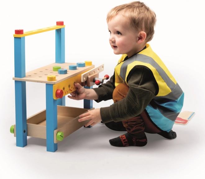 Sættet indeholder både træ- og plastværktøj – sav, skruetrækker, rørtang, hammer, beskyttelsesbriller og id-kort. Børn kan efterligne byggernes arbejde og udvikle finmotorikken.