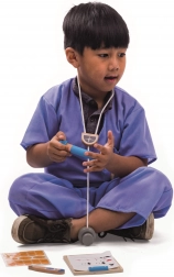 T-shirt, bukser, stetoskop i træ, lægeblok, termometer, lommeur, injektionssprøjte, plastre