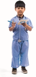 Det børnevenlige lægekostume fra BIGJIGS TOYS forvandler enhver leg til en redningsmission. Sættet indeholder en blå T-shirt og bukser med velcro for nem på- og afklædning samt masser af tilbehør: stetoskop i træ, lægeblok til noter, termometer, lommeur, injektionssprøjte og plastre. Kostumet er fremstillet af bomuld og polyester og kan maskinvaskes.