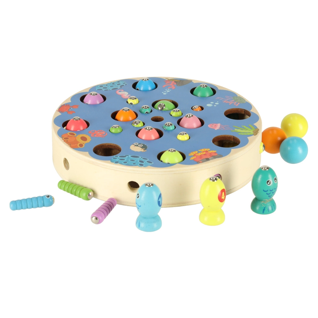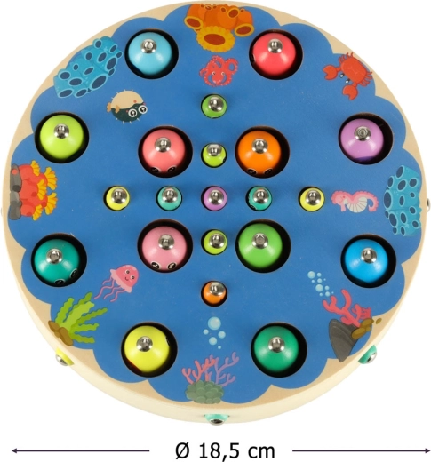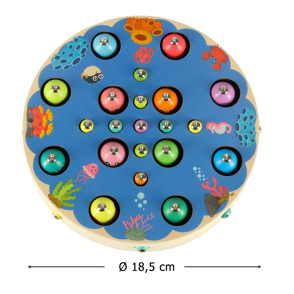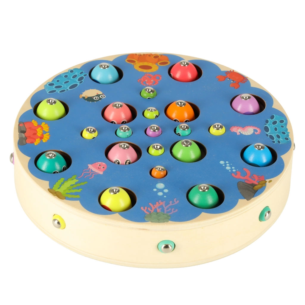 Det multifunktionelle Montessori‑sæt giver børn timevis af kreativ leg og læring. På den runde træbase med havmotiv fanger børn magnetiske fisk med stænger, trækker larver op, flytter kugler med pincet eller spisepinde og øver farver, sortering og tålmodighed. Takket være det rige tilbehør kan flere børn lege sammen.