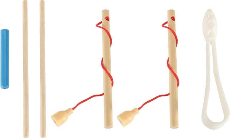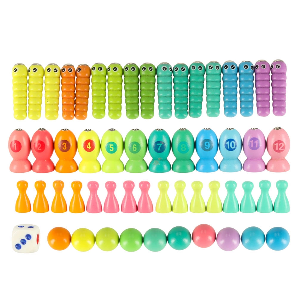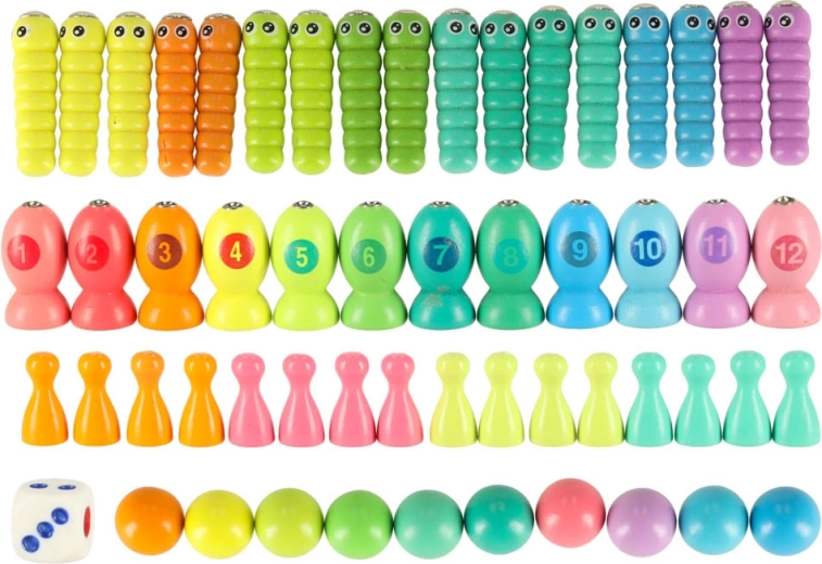 - 1× træbase, 2× stang, 2× spisepinde, 1× pincet, 4× silikoneskål, 10× trækugle, 12× fisk, 17× larve, 16× brik i 4 farver, 1× terning
