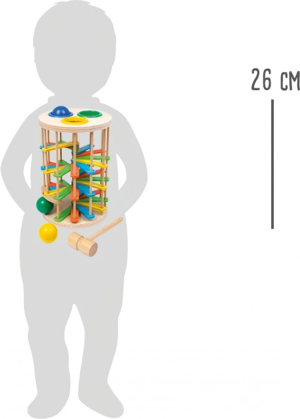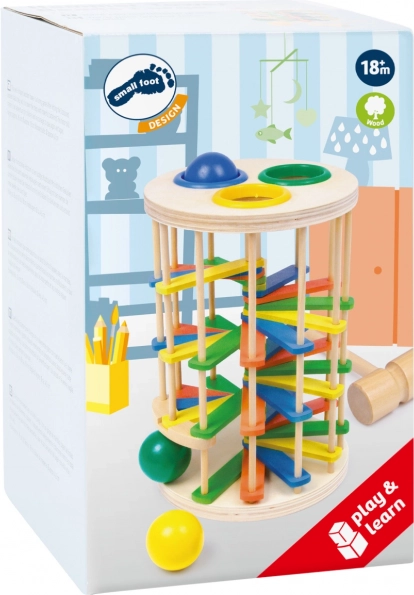 Hammerklods tårnet med kugler fra Small Foot er det perfekte legetøj til at udvikle børns motoriske færdigheder. Det består af et tårn, hvor børn hamrer 3 farverige kugler gennem plastikringe og følger, hvordan kuglerne falder ned ad trappen og laver en klikkelyd.