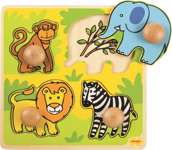 Når børnene lægger alle brikkerne på de rigtige pladser, opstår et levende safarimotiv. Takket være de store greb ligger brikkerne godt i selv de mindste hænder, og puslespillet motiverer til at navngive dyrene, udvide ordforrådet og træne hånd-øje-koordination.