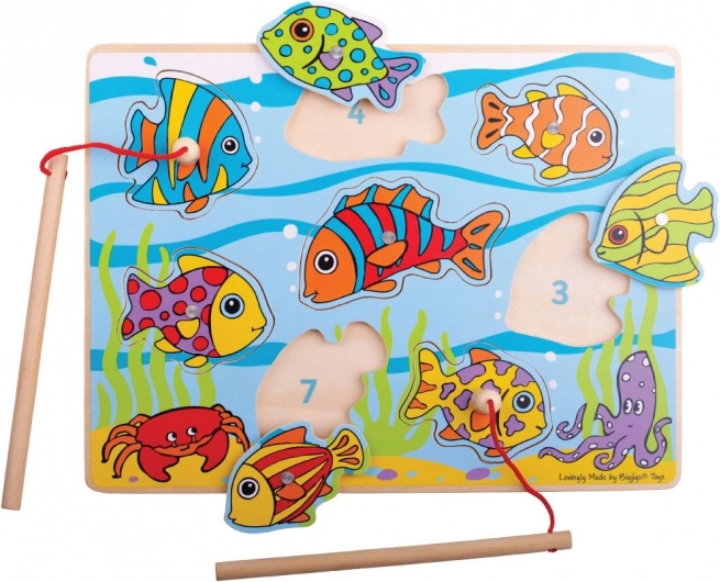 Den magnetiske leg Bigjigs Toys fiskeri af små fisk er en ideel aktivitet for børn fra 10 måneder. Med den magnetiske fiskestang fanger børn fiskene og lærer at placere dem tilbage i de rigtige formede huller. Legen udvikler naturligt tålmodighed, logisk tænkning og præcision i bevægelserne.