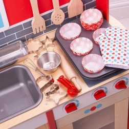Dette omfattende bagesæt indeholder alt det udstyr, som enhver lille kok har brug for til sin første bagning. Inkluderer bageplade, grydelap, brødform, piskeris, træ-kagerulle, skål, sæt måleskeer og seks kageudstikkere.