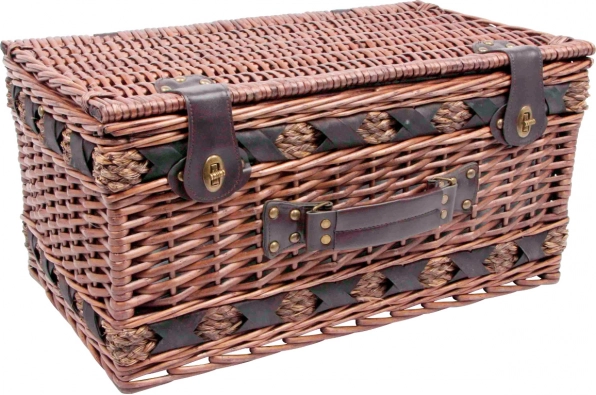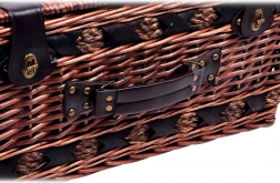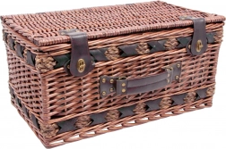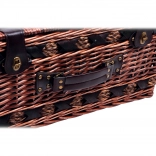 Picnic-kurven Deluxe er det ideelle valg for dem, der sætter pris på både funktionalitet og æstetik. Denne kurv er fuldt udstyret til fire personer, inklusive tallerkener, bestik, vinglas, kniv, peberbøsse og saltbøsse. Det viste design kombinerer rustik charme med moderne praktikalitet.