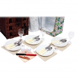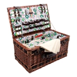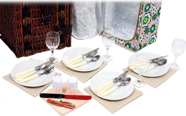Kurven indeholder alt nødvendigt til en picnic med familie eller venner: tallerkener, bestik, vinglas, kniv, peberbøsse, saltbøsse og servietter.
