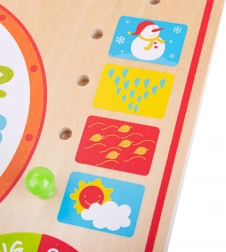 Pladen er overskuelig og indeholder et stort ur med bevægelige visere samt roterende eller skydbare markører for dage, måneder, vejr og årstider. De grundlæggende beskrivelser er på engelsk, så barnet får et naturligt sprogligt udbytte. Produktet er fremstillet af holdbart, ansvarligt indkøbt træ og egner sig til daglig brug derhjemme og i institutioner.