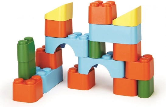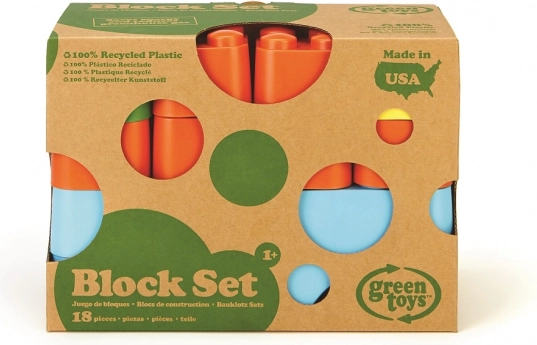 Økologisk byggesæt fra Green Toys – 18 sikre klodser af genanvendt plast. Lette, stærke, uden PVC, BPA og ftalater. Velegnet fra 6 måneder.