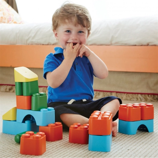 Oplev sjov og bæredygtigt design i ét sæt. Green Toys-klodserne er lette, men samtidig stærke og holdbare, fremstillet i USA af genanvendt plast fra mælkeflasker. Børn kan bygge slotte, tårne og deres egne fantasifulde konstruktioner uden risiko for små dele eller skarpe kanter.