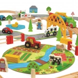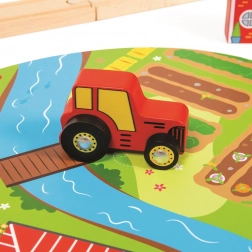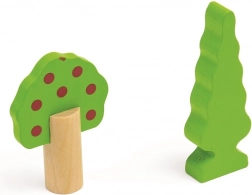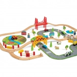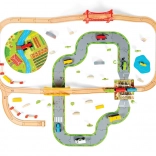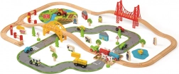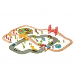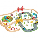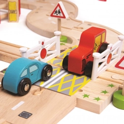 Denne trætogbane med landevej er den perfekte kombination af tog- og bilbaner, der efterligner den virkelige transportverden. Med broer og overkørsler kommer dine børn ind i en verden fuld af sjove eventyr. Alt er suppleret med lokale tilbehør som gård, bygninger og træer, der forskønner omgivelserne.