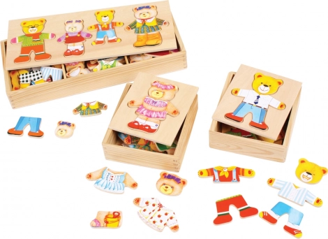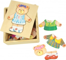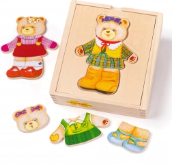 Sødt påklædningspuslespil i træ til de mindste hjælper børn med at kombinere tøj og ansigtsudtryk hos bjørnefruen. Indeholder 18 brikker, en praktisk æske med låg/plade og understøtter finmotorik, øje-hånd-koordination og ordforråd. Fremstillet af kvalitetstræ, sikkert fra 3 år og i overensstemmelse med europæiske sikkerhedsstandarder.