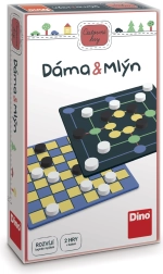 Rejseudgaven dam og mølle fra Dino er det ideelle valg til familieudflugter, ferier og ventetid på farten. Den dobbeltsidede plade vendes nemt – på den ene side er et 8 × 8 bræt til dam, på den anden klassisk opsætning til mølle. Ét sæt brikker rækker til begge spil, så du behøver ikke andet.