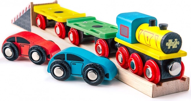 Lokomotiv med to vogne transporterer to små biler i klare farver – ideelt til scenarier med pålæsning, transport og aflæsning.