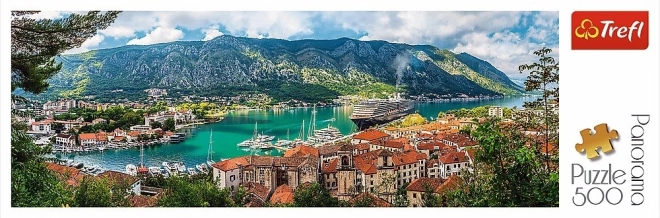 Puslespillet viser det maleriske sceneri af havnebyen Kotor med sine ikoniske røde tage og grønne bjerge.