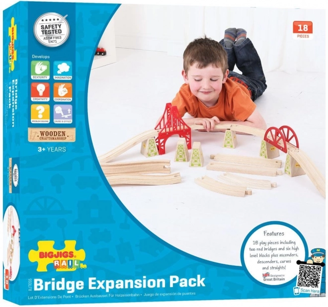 Udvid din trætogbane med et universelt brosæt med 18 dele, som tilføjer nye højder og eventyr til legen. Sættet indeholder stigende og faldende skinner, støttepiller og broelementer, så forhindringer nemt kan overvindes. Det er fuldt kompatibelt med de fleste trætogbaner og er lavet af kvalitets træ. Kompatibilitet, kvalitetsmaterialer, sikker leg og udvikling af fantasi og finmotorik.