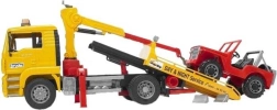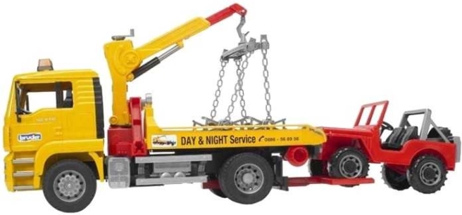 Bruder bjærgningsvogn MAN er det ideelle legetøj for børn, der elsker simulationer og leg med realistiske bilmodeller. Køretøjet tilbyder en vippekabine, der gør det muligt at kigge ind i motorrummet, og er udstyret med en forrude af holdbart polykarbonat. Bag kabinen er der en drejende manipulationsarm med kæder for nem håndtering af jeepen.