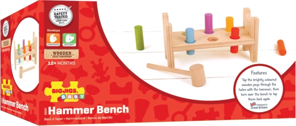 Denne klassiske træhammerbænk fra Bigjigs Baby begejstrer med sin enkle idé – tapperne bankes ned i hullerne med køllen, derefter vender man bænken, og legen kan begynde forfra. De klare farver stimulerer sanserne og fremmer koncentrationen.