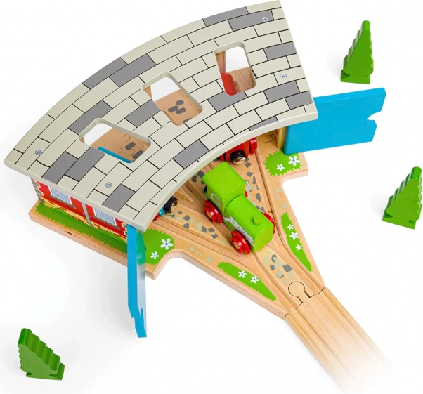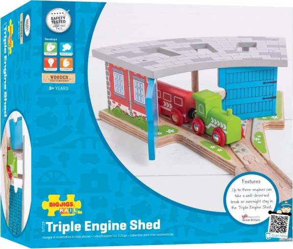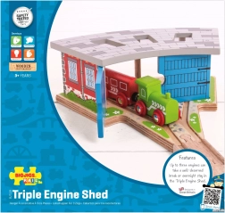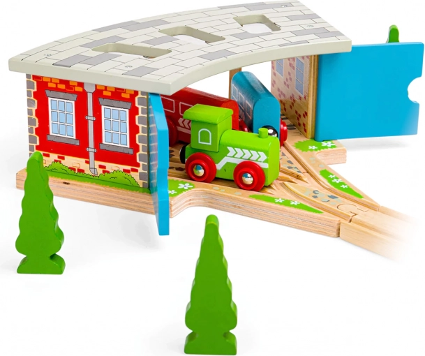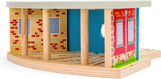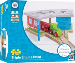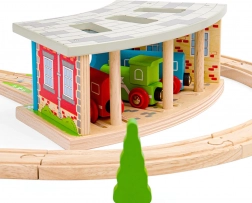 Det tredobbelte depot med porte er et ideelt tilbehør til enhver lille lokomotivfører. Med tre pladser og integreret skinneforbindelse organiserer du nemt trafikken på banen og parkerer togene efter en dag fuld af kørsel. Den solide trækonstruktion med farverige detaljer virker realistisk og tåler selv intensiv leg.