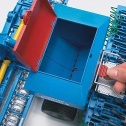 Beholderen kan fyldes med sand eller andet løst materiale og tømmes igen med ét håndtag – ideel til realistisk leg.